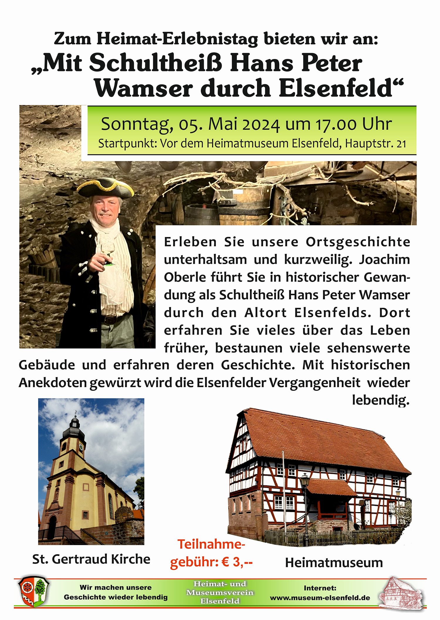 Erleben Sie unsere Ortsgeschichte unterhaltsam und kurzweilig. Joachim Oberle führt Sie in historischer Gewandung als Schultheiß Hans Peter Wamser durch den Altort Elsenfelds. Dort erfahren Sie vieles über das Leben früher, bestaunen viele sehenswerte Gebäude und erfahren deren Geschichte. Mit historischen Anekdoten gewürzt wird die Elsenfelder Vergangenheit wieder lebendig.