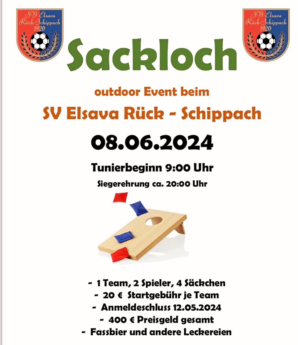Am 08.06.2024 steht das Outdoor Sackloch Turnier bei uns auf dem Sportgelände auf der Tagesordnung. Wir freuen uns, diese Veranstaltung zum ersten mal in unserer Vereinsgeschichte durchzuführen und freuen uns auf zahlreiche Anmeldungen. Seid schnell bevor das Turnier ausgebucht ist.