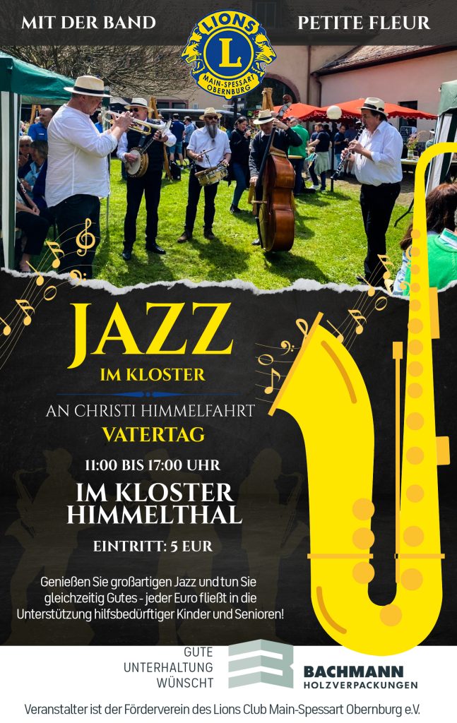Im romantischen Innenhof des Kloster Himmelthal, gelegen zwischen Eschau und Elsenfeld-Rück, findet an Christi Himmelfahrt, Donnerstag, 29.05.2025, das traditionelle Lions Jazzfest statt.