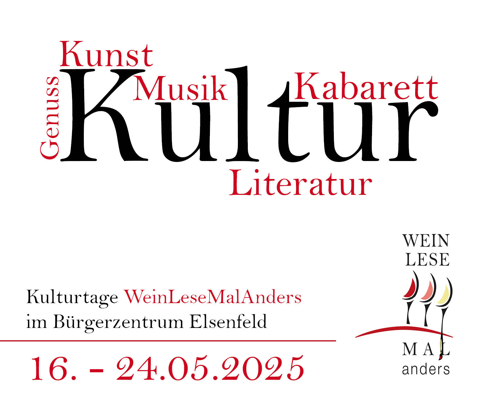 Die in den letzten Jahren erfolgreiche Elsenfelder Kulturwoche geht im Mai 2025 bereits in die siebte Runde. Ab Freitag, 16. Mai 2025 steht eine gelungene Kombination aus Kultur und Kunst im Mittelpunkt des Bürgerzentrums. Das Konzept Kultur mit Kunst zu verbinden, kommt an.