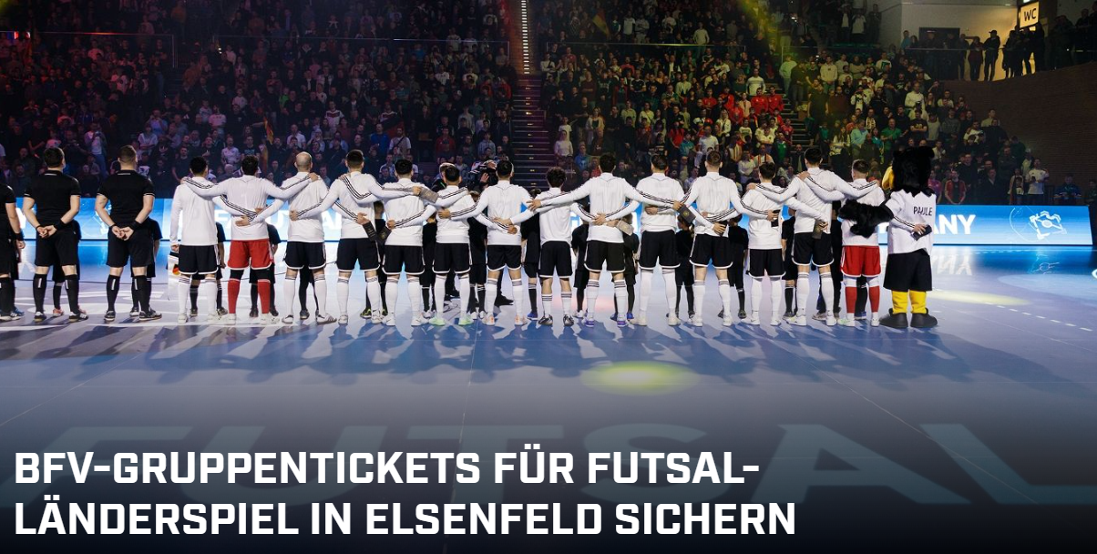 Die deutsche Futsal-Nationalmannschaft startet in die neue Saison. Das Team von Bundestrainer Marcel Loosveld trifft im Oktober in zwei Länderspielen auf Finnland – einmal davon im Freistaat: Am Dienstag, 21. Oktober (ab 18.30 Uhr), in der Untermainhalle in Elsenfeld. Für alle bayerischen Vereine und Gruppen gibt es exklusive BFV-Tickets für 4 Euro pro Person (Mindestabnahme zehn Karten). Im Online-Portal einfach den Aktions-Code LV-Ticket eingeben und dann die gewünschten Plätze auswählen.