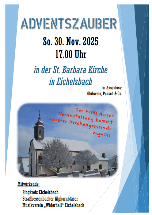 Adventszauber am Sonntag, den 30.11.2025, um 17:00 Uhr in der St. Barbara Kirche in Eichelsbach.