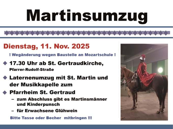 Andacht in der St. Pius Kirche. Anschließend Zug mit dem Musikverein Regina und Pferd zum Kindergarten und gemütliches Beisammensein. Dort ist für das leibliche Wohl gesorgt.
