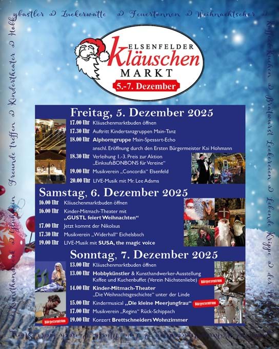 Mitten in Elsenfeld in weihnachtlichem Ambiente unter der Linde findet auch in diesem Jahr wieder der beliebte "Kläuschenmarkt" statt. Von Jahr zu Jahr begeistert er immer mehr Einheimische und Gäste. Gespräche statt Gedudel und Handgefertigtes statt Plastik erwarten Sie am 2. Adventswochenende. Kunsthandwerker und Aussteller bieten hochwertige Dekoartikel, Geschenkideen und kulinarische Köstlichkeiten an. Ein abwechslungsreiches Rahmenprogramm mit musikalischen und traditionellen Highlights sorgen für die passende Stimmung. Für die Kleinen findet am Sonntag immer im benachbarten Bürgerzentrum im Rahmen des Kulturwochenherbstes das Kindermusical statt. Außerdem bringt der Nikolaus kleine Geschenke.