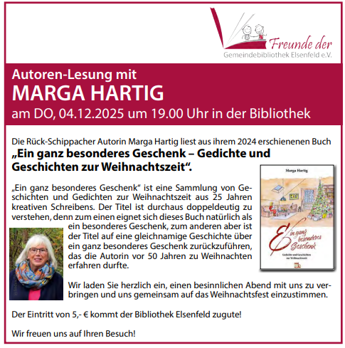 Autoren-Lesung mit Marga Hartig am DO, 04.12.2025 um 19.00 Uhr in der Bibliothek
