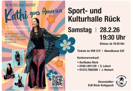 Ein musikalischer Roadtrip auf den Spuren von Woodstock – von und mit Katharina Martin „Kathie goes America“. Wer Evergreens, Rockklassiker und die Schlager dieser Zeit liebt, ist hier genau richtig. Freuen Sie sich auf unvergessene Hits von Johnny Cash, Dusty Springfield, Joe Cocker, Tina Turner, CCR, Dolly Parton, den Beatles und vielen mehr