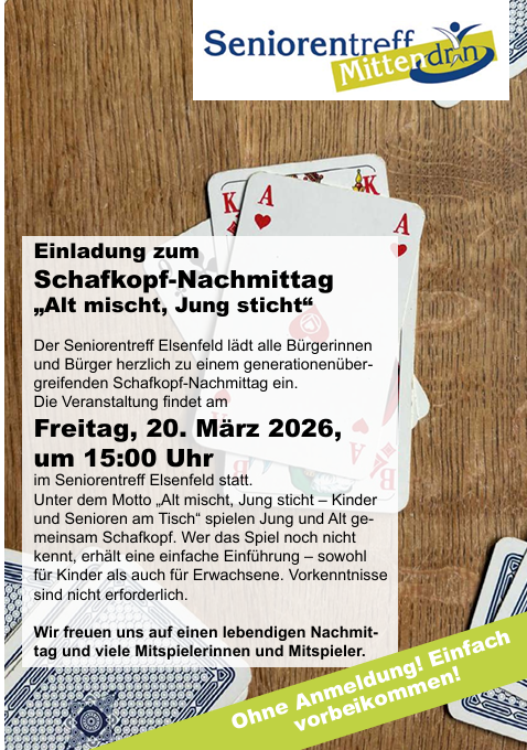 Der Seniorentreff Elsenfeld lädt alle Bürgerinnen und Bürger herzlich zu einem generationenübergreifenden Schafkopf-Nachmittag ein. Die Veranstaltung findet am Freitag, 20. März 2026, um 15:00 Uhr im Seniorentreff Elsenfeld statt. Unter dem Motto „Alt mischt, Jung sticht – Kinder und Senioren am Tisch“ spielen Jung und Alt gemeinsam Schafkopf. Wer das Spiel noch nicht kennt, erhält eine einfache Einführung – sowohl für Kinder als auch für Erwachsene. Vorkenntnisse sind nicht erforderlich. Wir freuen uns auf einen lebendigen Nachmittag und viele Mitspielerinnen und Mitspieler.