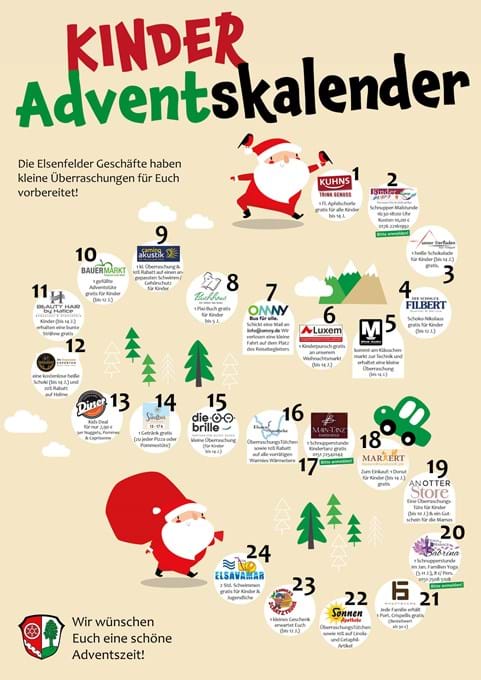 Wir freuen uns, bereits zum zweiten Mal den Kinder-Adventskalender in Elsenfeld zu präsentieren. Viele Geschäfte und Gewerbetreibenden haben sich die verschiedensten Aktionen und Geschenke für Euch ausgedacht!