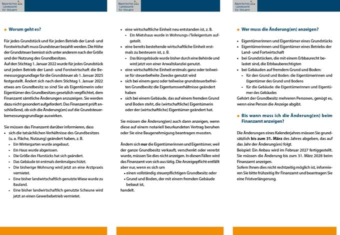 Auf den Stichtag 1. Januar 2022 wurde für jedes Grundstück und jeden Betrieb der Land- und Forstwirtschaft die Bemessungsgrundlage für die Grundsteuer ab 1. Januar 2025 festgestellt. Ändert sich nach dem Stichtag 1. Januar 2022 etwas am Grundbesitz so sind Sie als Eigentümerin oder Eigentümer des Grundbesitzes gesetzlich verpflichtet, dem Finanzamt sämtliche Änderungen anzuzeigen. Sie werden dazu nicht gesondert aufgefordert. Das Finanzamt prüft anschließend, ob sich die Änderung(en) auf die Grundsteuerbemessungsgrundlage auswirken.