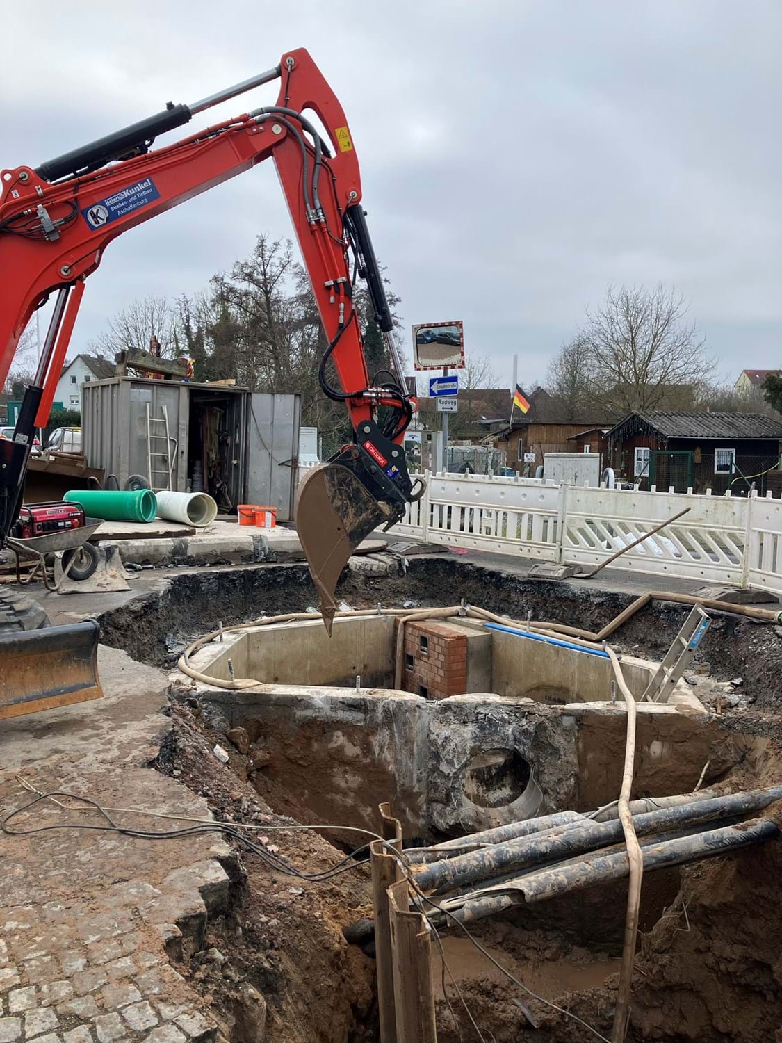 ich freue mich, Euch wieder was Neues von unserer Baustelle in der Rathausstraße berichten zu können und habe Euch zwei Fotos mitgebracht. Ein großes Loch tut sich auf, wo der Mühlweg in die Hauptstraße mündet. Dort muss ein großes Kanalbauwerk eingebracht werden. Das wird ungefähr zwei Wochen dauern. Ab Ende Februar kommt dann die Wasser-Notversorgung für den Bauabschnitt 1 zwischen Mühlweg und Frühlingstraße. Ab 23. Februar beginnen die Erdarbeiten für die Wasserleitung in diesem Bereich. Dabei wird die Hauptstraße auf einer Länge von 115 m in der Osthälfte geöffnet. Es lässt sich nicht vermeiden, dass die Anwohner der Hauptstraße 41-55 tageweise nicht in ihren Hof fahren können, weil dort gerade die Wasserleitung verlegt wird. Der Graben wird aber immer gleich wieder verfüllt. Auch der Einmündungsbereich Frühlingstraße/Hauptstraße wird an einem Tag Ende Februar nicht befahrbar sein, weil die neue Wasserleitung dort an das Bestandsnetz angeschlossen wird.